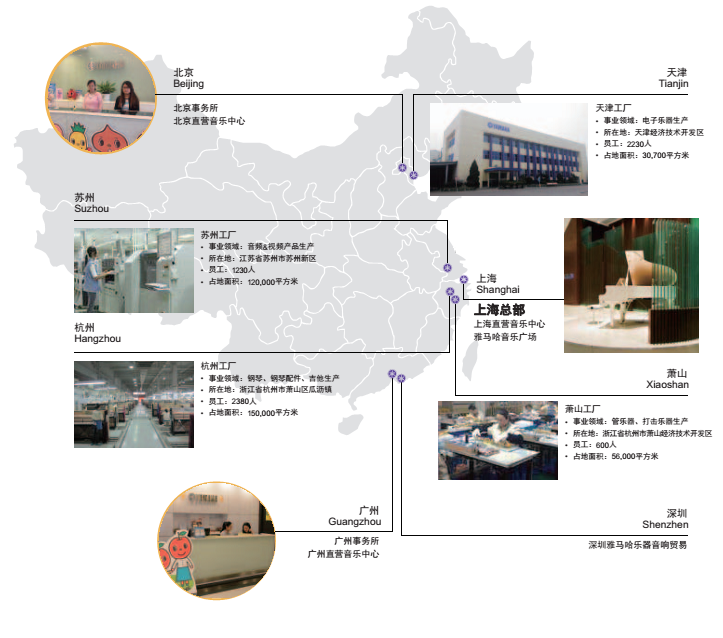 雅馬哈樂器音響(中國)投資有限公司成立于2002年5月,是由日本雅馬哈株式會社在華投資組建的外商獨資企業,后又陸續在中國成立了其它6家子公司,分別為雅馬哈電子(蘇州)有限公司、杭州雅馬哈樂器有限公司、天津雅馬哈電子樂器有限公司、蕭山雅馬哈樂器有限公司、雅馬哈貿易(上海)有限公司、雅馬哈樂器技術培訓(上海)有限公司以及深圳雅馬哈樂器音響貿易有限公司。上述七家子公司共同囊括了雅馬哈在中國的所有樂器音響事業。