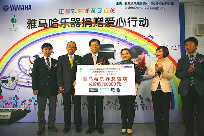 2013年10月22日, “助力音樂教育 奏響愛的樂章——雅馬哈樂器捐贈愛心行動”在天津泰達實驗小學舉行。本次活動是雅馬哈公司開展以打工子弟小學生為對象的樂器愛心捐贈活動第三站。由雅馬哈在華事業總部雅馬哈樂器音響(中國)投資有限公司與天津雅馬哈電子樂器有限公司攜手舉辦,向天津泰達小學、天津實驗小學、天津閩侯路小學、天津市萬全道小學、天津市薊縣西山一中小學、天津寶坻區大口屯鎮中心小學、天津市開發區中學等七所學校捐贈了包括立式鋼琴7臺、電子琴210臺、音響設備7套等總價值超過70萬元的雅馬哈樂器,協助學校樂器設備的配備,并冠名為“愛心音樂教室”,打造屬于孩子們的音樂小天地。津市經濟技術開發區教育文化衛生局領導和受贈小學的領導以及日本雅馬哈樂器株式會社佐佐木勉顧問、雅馬哈樂器音響(中國)投資有限公司山口靜一總經理等嘉賓出席了捐贈儀式。