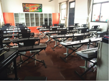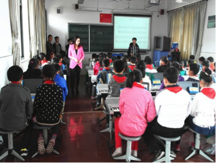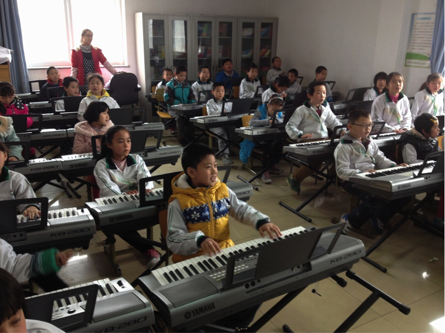 雅馬哈的領導給學生送紀念品隨后我們轉移去了音樂教室,那里擺放著去年雅馬哈捐贈的30臺電子琴。該校的音樂老師在一年時間里教會了孩子們彈簡單的曲子,借此機會作了短小的匯報演出,林芝老師在一旁觀摩指導。同學們先分聲部抓準了節拍,然后進行合奏,效果出奇的好。雅馬哈捐贈的樂器能獲得很大價值的使用,是對這項活動良好的肯定。事后,林芝老師與學校的音樂老師交流了一下經驗,對于如何更好地上音樂課都有了新的認識。