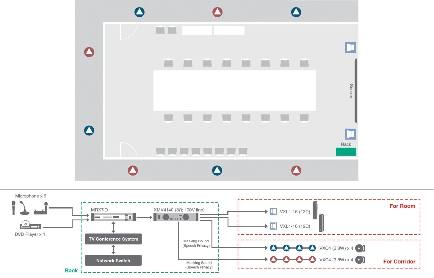 此類功能房間在現代化辦公室、金融機構、醫療機構等場所非常重要。在此介紹的系統將會為您帶來幫助。雖然遠程會議作為一種交流模式正在被廣泛使用,但是由音頻反饋引起的反饋聲和受損的清晰度依然被詬病。雅馬哈MRX7-D矩陣處理器的回聲消除器功能可高效抑制回聲,即使音箱的輸出聲被房間內的話筒拾取,也能消除各個方向的回聲。您可以通過增加VXL1窄型線陣音箱實現清晰度提升,這樣您就擁有了一套能夠進行順暢輕松交流的優秀且清晰的系統。MRX7-D還具有語音隱私系統,能夠對安裝在會議室外走廊上的音箱提供特殊的遮蔽信號,從而防止不相關人員在室外對偷聽會議。