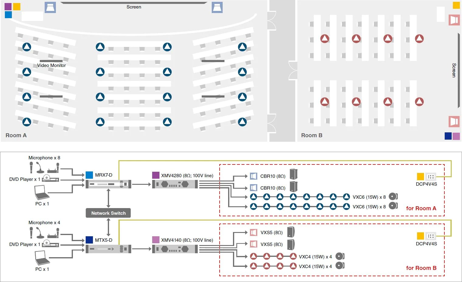 安裝在不同區(qū)域的DCP4V4S控制面板支持遠程控制音源、話筒的音量以及開/關。