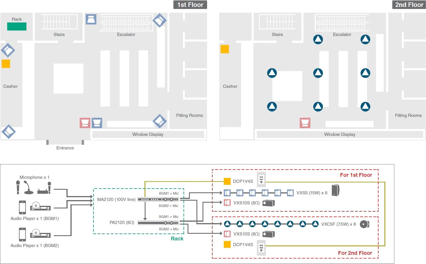 對于多層品牌專賣店或帶有酒吧、休息區的餐廳,此系統方案將會是不錯的選擇。背景音樂與室內的裝潢和燈光一樣,對營造特別的氣氛具有重要意義。雅馬哈VXS和VXC系列音箱能夠提供高品質音樂播放,為聽音區傳遞情感豐富的音樂,為整體氣氛營造做出重大貢獻。加入VXS10S超低音音箱能夠提升節奏類音樂的力度和刺激感。對不同區域播放不同背景音樂的同時,需要播放語音或廣告時, MA2120將會是您不錯的選擇。MA2120包含閃避器功能,當使用話筒時,能夠自動降低背景音樂的音量,而無需進行任何手動操作。安裝在不同區域的DCP1V4S控制面板支持遠程控制背景音樂的音量和其他操作。