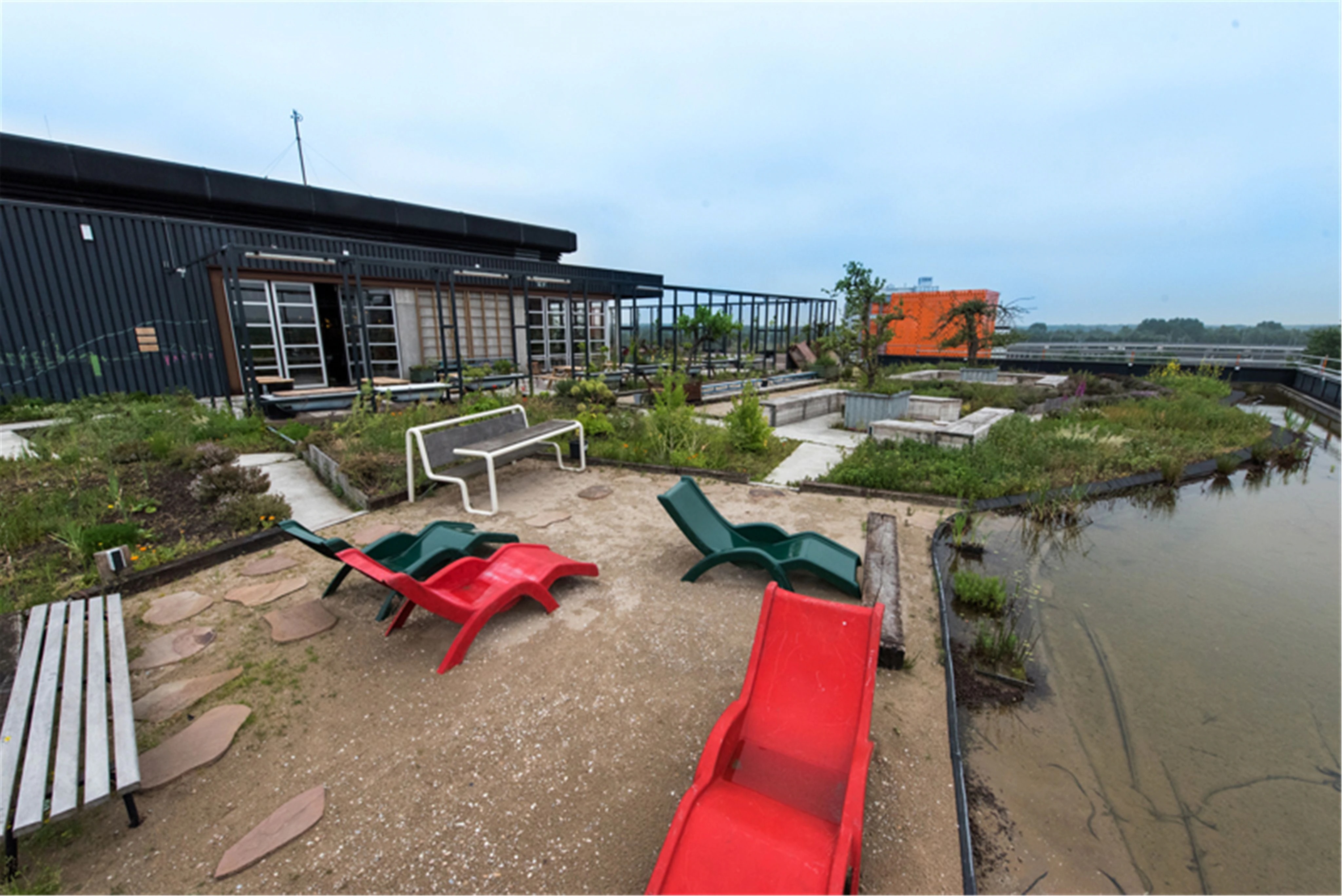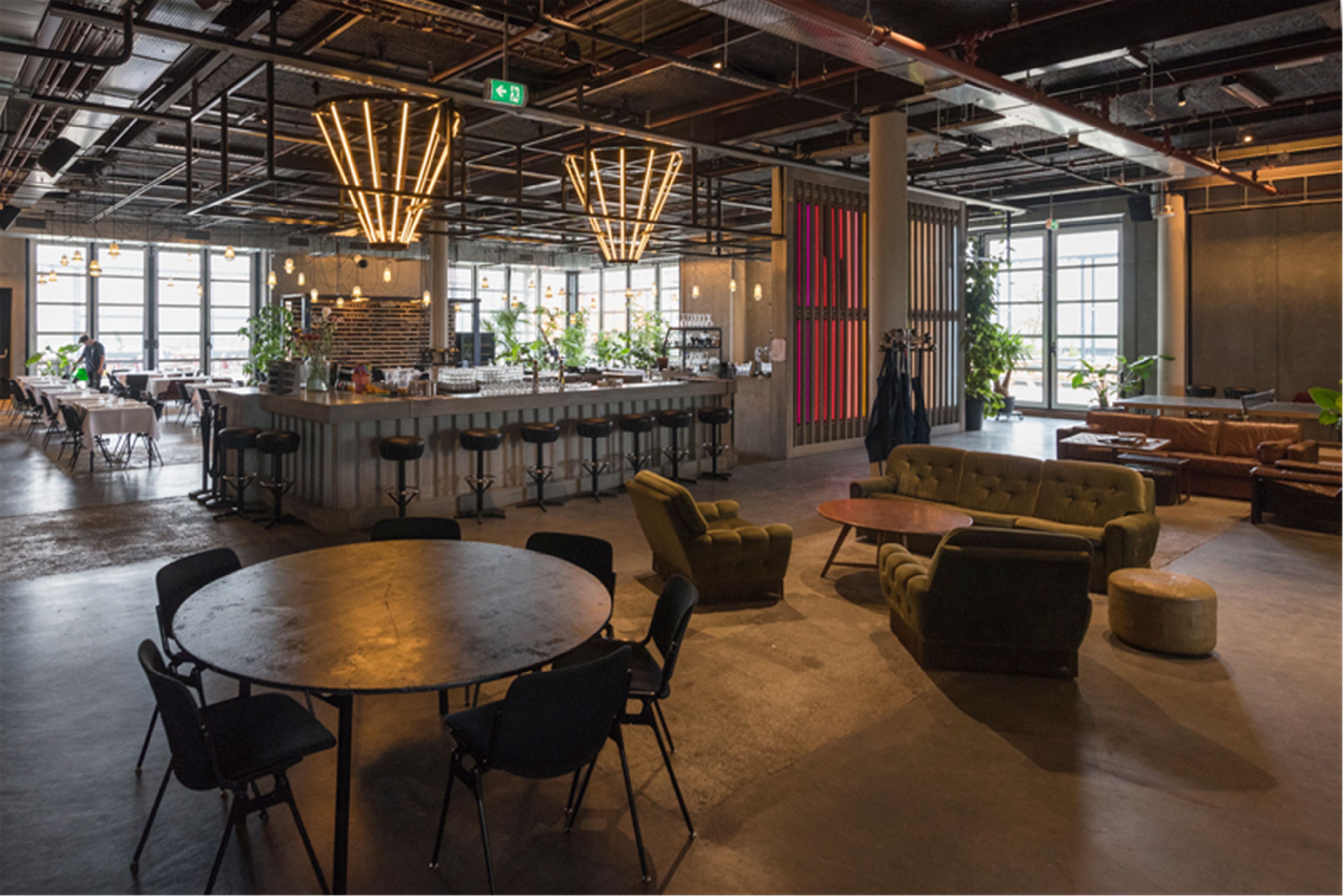 B-Amsterdam于2015年開業,將這座城市40,000平方米的老IBM大樓轉變成一個充滿想象力的多功能辦公室,供小型企業和個體經營者使用,為其提供工作和活動空間。全新的頂層餐廳Bureau是一家創意餐廳,常被用于午餐、晚餐、私人聚會、籌款和講演會,餐廳的許多食材都生長在相鄰的屋頂花園中,這個花園區域也被用于戶外餐飲和社交。
