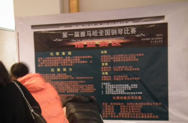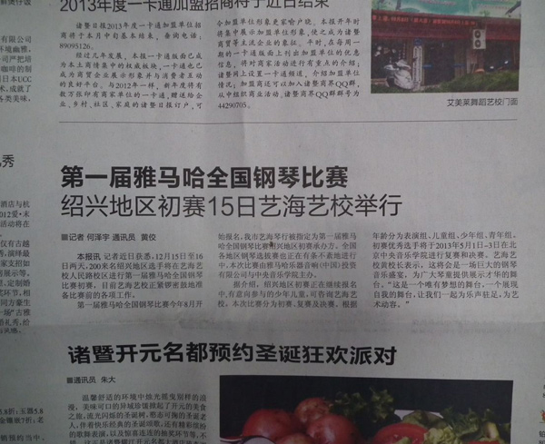 12月14、15日,經過兩天的比賽,屆雅馬哈全國鋼琴比賽諸暨藝海琴行初賽在藝海藝校音樂廳圓滿完成。通過藝海琴行網站、全體學員、各校區培訓中心海報張貼,通過諸暨市官方報紙《諸暨日報》新聞追蹤報道、橫幅、海報、專門會議等宣傳了這一大規模賽事及組織報名工作。
