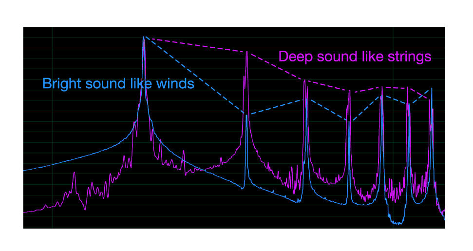 樂器的音色是由基本頻率及其整數(shù)倍頻率(=倍音)組成。加速音也類似,通過設(shè)計(jì)倍音成分,從管樂器清晰的聲音到弦樂器有力的聲音都可廣泛地表現(xiàn)。