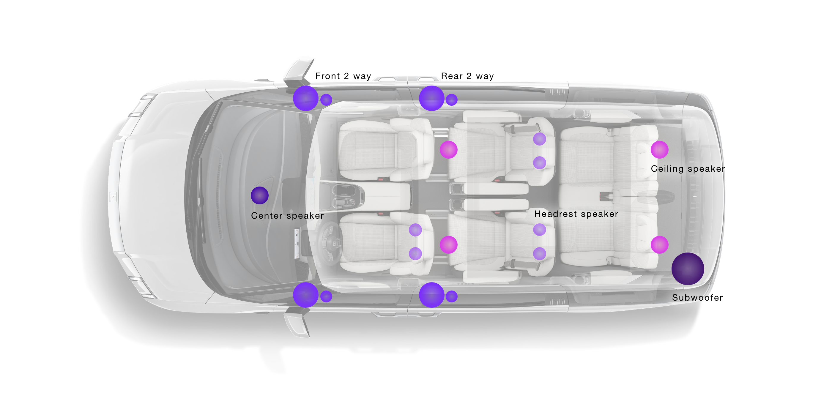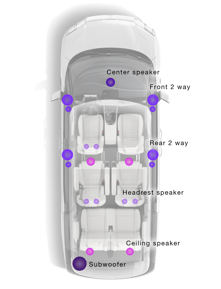 在可以營造清澈而豐富聲音的揚聲器構(gòu)成基礎(chǔ)上,針對棚頂和頭枕也加設(shè)了揚聲器單元。實現(xiàn)從上下前后全方位的聲音注入,誠邀您融入這非同一般的娛樂空間。