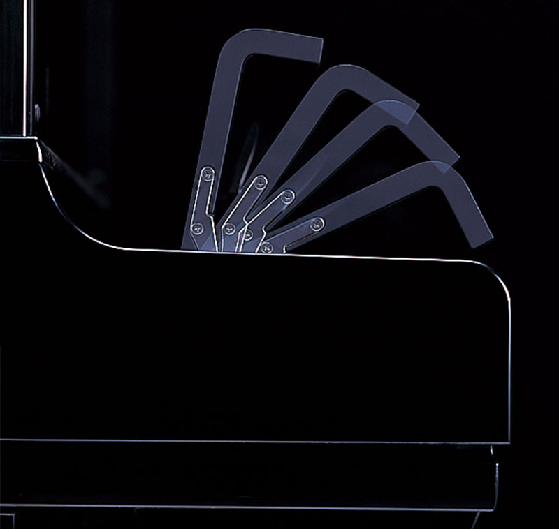 原聲鋼琴是一種通過琴體整體產生共鳴,使周圍的空氣振動,從而產生豐富聲響的樂器。為使彈奏者能夠切實感受到這種豐富的回響,并享受演奏的樂趣,YUS系列在下前板的上部(鍵盤的下部)和鍵盤蓋內側采用Tone Escape(可由鋼琴內部釋放出聲音的間隙)。此外,鋼琴的頂蓋部位采用可開合的頂桿支撐(YUS5配備可開閉式大譜架臺),實現了如彈奏三角鋼琴般的自然的聲音傳導。