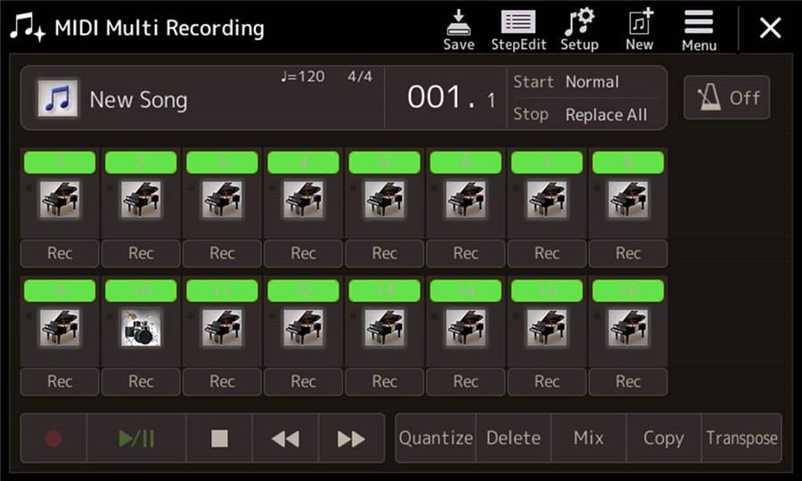 使用快速錄制功能可以將您的演奏快速錄制為音頻(WAV)或標準MIDI文件(SMF)。若要進行更加復雜的編排,多軌錄音能夠提供完整的帶有實時功能和分步功能的16軌MIDI音序器。
