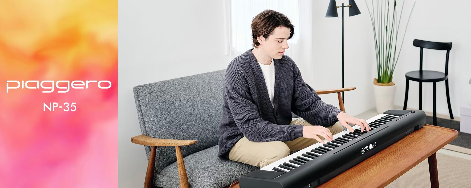 NP-35屬于 "Piaggero "系列,結合了 "Piano(鋼琴) "和 "leggero(輕快的) "一詞,后者是一個音樂術語,意思是 "輕快的、輕巧的"。正如其名,NP-35非常輕,即使對于便攜式鍵盤來說也是如此,因此你可以把它帶到任何地方。在室內、室外,甚至在旅行中,都可以放心地把它帶到你喜歡的地方去練習。